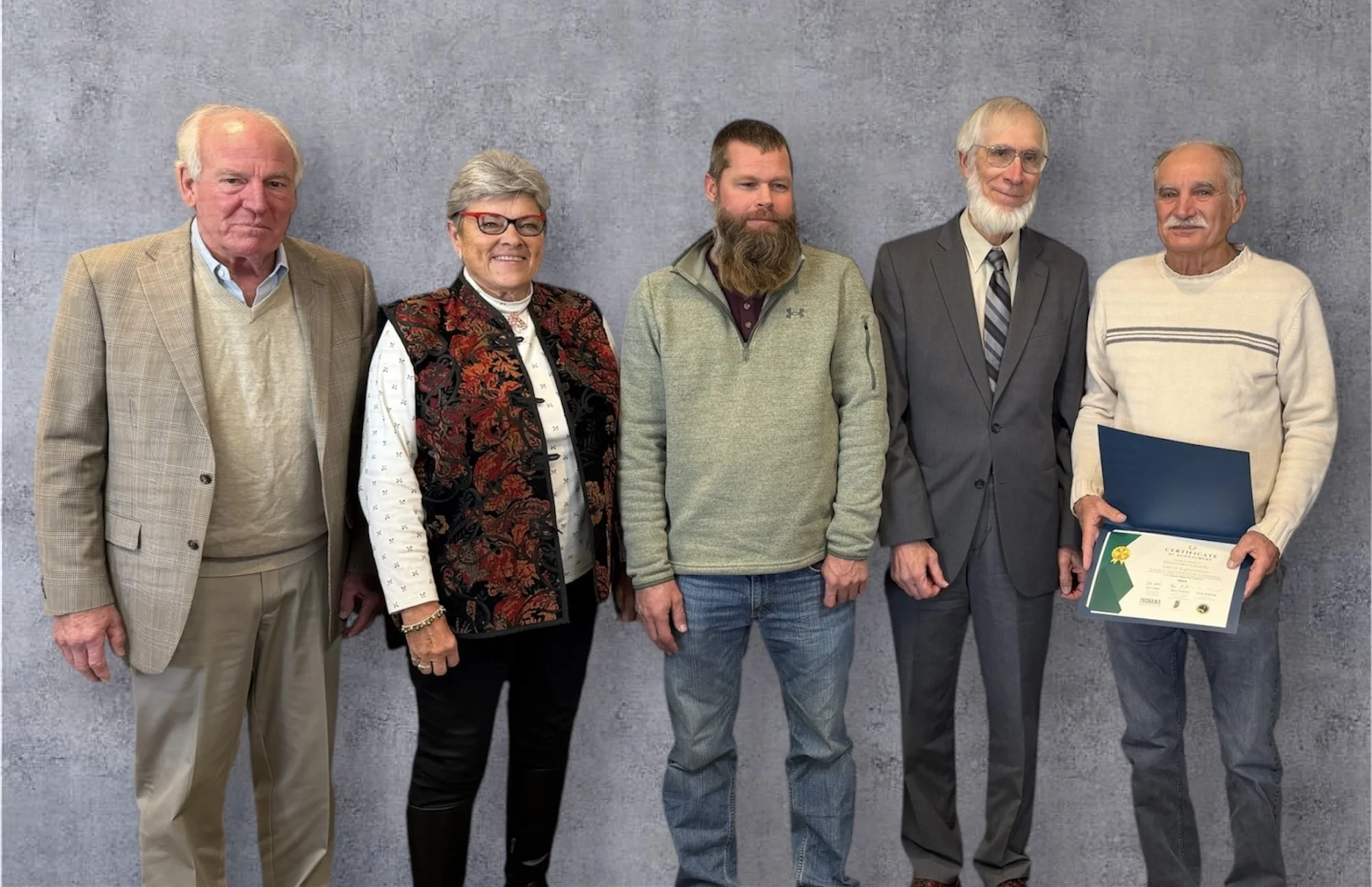 Kosciusko County SWCD Supervisors received a certificate of achievement (2024). In recognition of outstanding leadership and dedication to conservation in Indiana, and successfully completing modules in the Board Leadership Program.