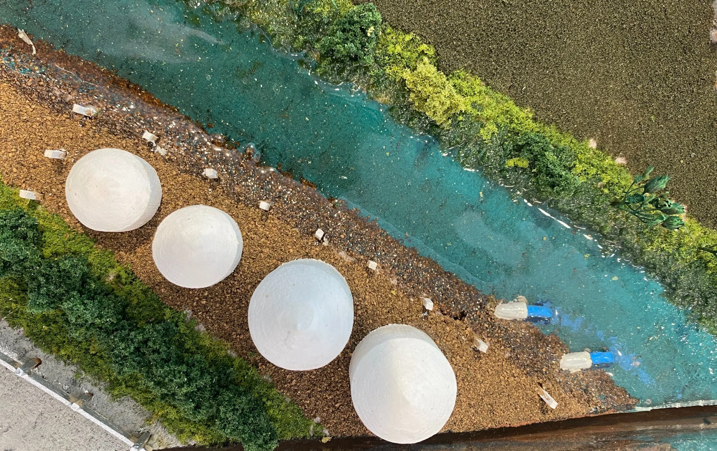 The white tanks in the corner of this neighborhood are part of the wastewater treatment plant. Wastewater from urban areas is transported here by pipeline. Pollutants are removed from the wastewater through physical, chemical, and biological processes before the treated water is released into the river.